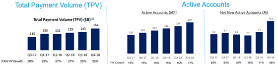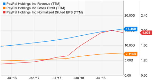 从公司财报可以发现,PayPal总交易额快速增长,18年四个财季一直保持在25%以上的水平,月活用户增长速率同比大于15%,而且在18年第四财季公司新增月活用户同比增长达到58%。