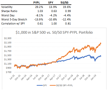 如果将资金平均分成两份,分别买入PayPal和标普500指数,从2015年7月本轮市场行情启动开始计算,该资产组合的年化收益将近22%,远超过标普500指数的13.9%。