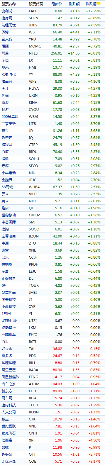 中概股周一多数上涨,其中7支股票涨幅超过6%,流利说涨12.29%报10.60美元,搜房网涨8.89%报1.47美元,前程无忧涨7.59%报8.379美元,微博涨7.11%报66.40美元,宜人贷涨6.78%报14.48美元,陌陌涨6.72%报40.81美元,网易涨6.03%报256.01美元。