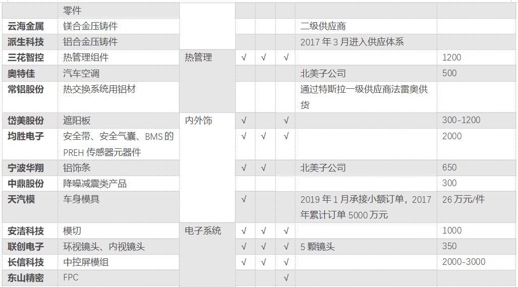当前特斯拉的中国供应商主要集中于金属结构件、热管理二级供应商、内外饰二级供应商、电子电气二级供应商等领域。这些供应商多数在其自身细分领域中质地优秀,且配套产品有扩增空间,如横向扩充产品品类,或二级向一级拓展。