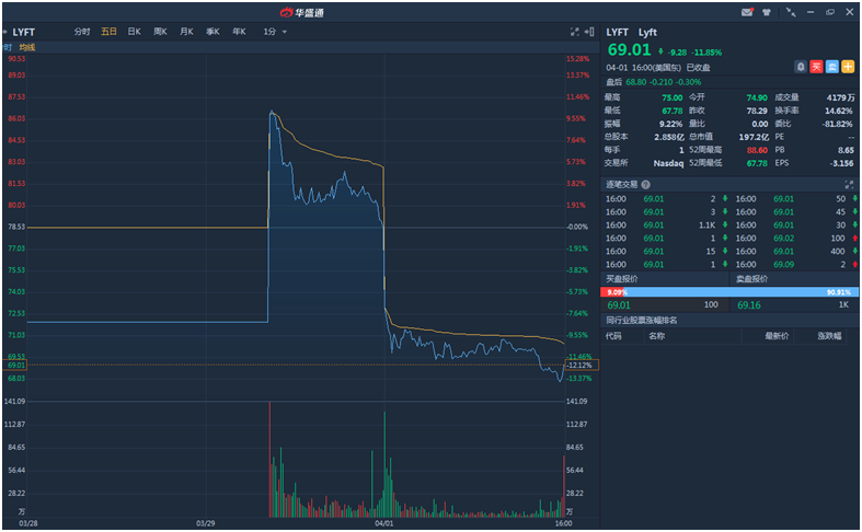 于是刚过完周末,市场集体回暖,但Lyft迎来“黑色星期一”,公司遭Hedgeye看空,跌破发行价72美元,暴跌11.85%至69.01美元,较上周五盘中高点88.60美元下跌了22%。市值也跌破两百亿美元大关,只有197亿美元。