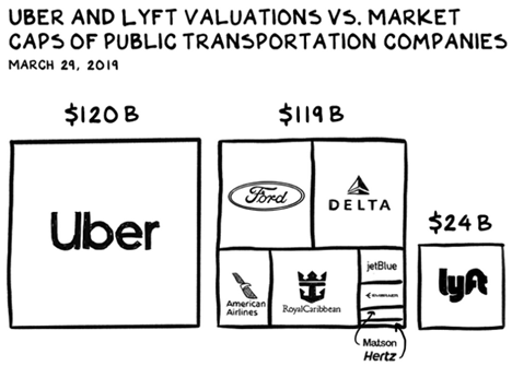 纽约大学斯特恩商学院的教授Scott Galloway认为Lyft将会下跌到35美元,因为他将所有交通运输类的股票市值进行了比对,从下图可以发现,将福特、达等一众公司的市值加起来也才1190亿美元,而仅仅提供平台,没有任何实质产出的网约车Uber则拥有1200亿的估值,一个福特公司的市值才仅仅358亿美元。