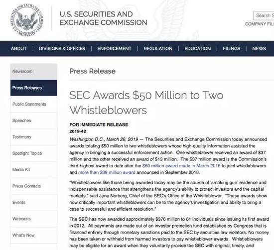 这并不是SEC开出的第一份巨额奖金。2018年3月,SEC的一纸文件,揭晓了一桩史上最高的“告密奖”。当时美国银行美林证券的三名内部人员举报公司擅自挪用客户资金,获得了高达8300万美元的奖励,其中两人获得5000万美元,另一人获得3300万美元,美银美林也因此被美国证监会罚了4.15亿美元。自2012年首次颁发奖金以来,SEC已经支付了约3.76亿美元。此前,美国证监交易委员会向国会提交的一份报告显示,举报人计划在2018财年获得了创纪录的5282条线索,相较2018年同期增长18%,相较于2012年增长了近一倍。