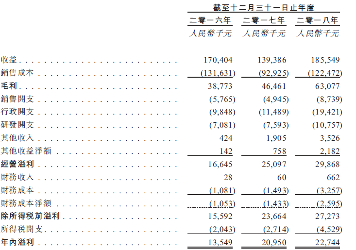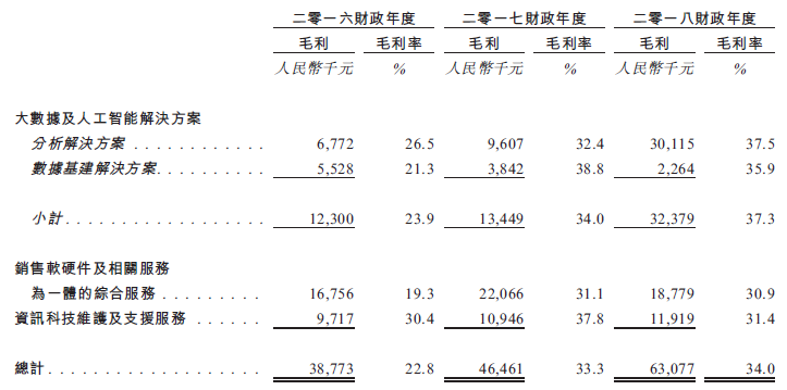 2016至2018年期间公司分别实现营收1.7亿元、1.39亿元及1.86亿元,并获得年内利润1354.9万、2090万及2274.4万元。从成本角度,销售成本主要集中在数据基建及软硬件销售综合服务的软硬件采购成本,占总收益比例逐年下滑,三年分别为77.2%、66.7%及66.0%。结合以上主营结构的变化,公司从前期的软硬件销售逐渐转向当前的数据分析服务。