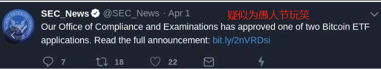 对于今日比特币的大涨,也有媒体称是由于美国证券交易委员会(SEC)通过了比特币ETF带来的影响,但实际上这则新闻只是一个愚人节玩笑。