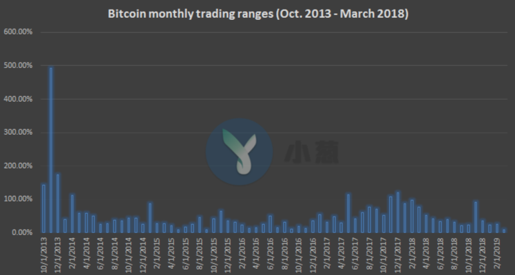 此外据媒体报道,近日比特币月度交易区间已下跌至7.8%,有可能创下有史以来的最低水平。相比之下,该项数据在2017年初和2017年底分别为21.2%和100%+。有分析称,市场低波动性往往与比特币的“长期牛市”相对应,低波动性有望为价格进一步上涨奠定基础。