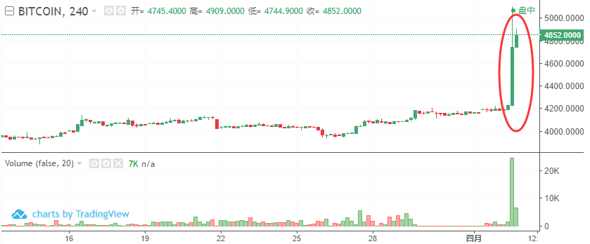 随后涨幅进一步扩大,到下午13:22,比特币突破5000美元关口,创下四个多月以来新高,日内涨幅扩大至19%,较日内低点大涨800美元。另据小葱,比特币30分钟即时成交量创近一周左右以来新高。