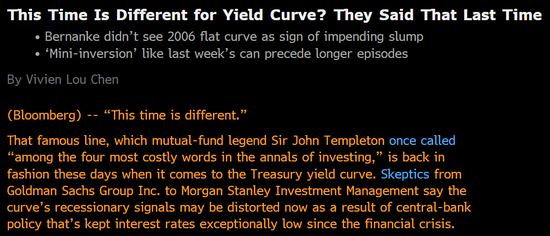 收益率曲线倒挂“这次真不同”吗? 只记得上次衰退前他们也是这么说的。共同基金界的传奇John Templeton曾经表示,这句话是“投资史上代价最高昂的四句话之一”。就国债收益率曲线而言,这句话最近又重新流行起来。从高盛集团到摩根士丹利的怀疑论者纷纷表示,由于自金融危机以来央行将利率保持在异常低的水平,收益率曲线的经济衰退信号可能被扭曲了。