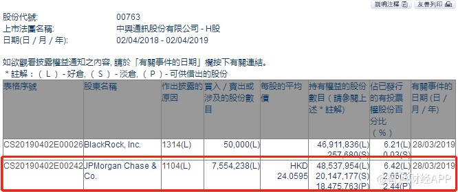 根据联交所资料显示,摩根大通于3月28日增持中兴通讯(00763)755万股,每股作价24.0595港元,总值约1.8亿港元,最新持股数目4,853万股,最新持股比例增至6.42%。