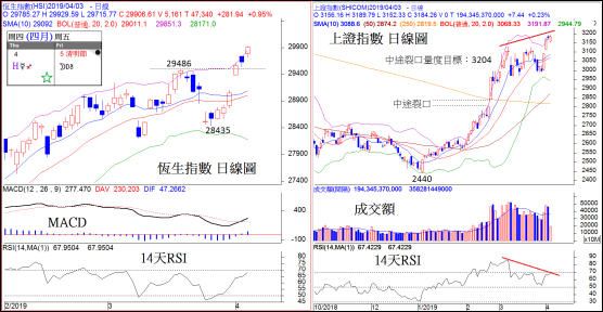 A股方面,上證指數繼續造好,短期內仍有機會上試「中途裂口」的量度上升目標3204。雖然強勢暫時維持不變,但要留意的是,14天RSI在超買區呈現一浪低於一浪的情況,亦即出現初步的雙頂背馳,表示短期升勢可能接近尾聲,故不宜過份樂觀。