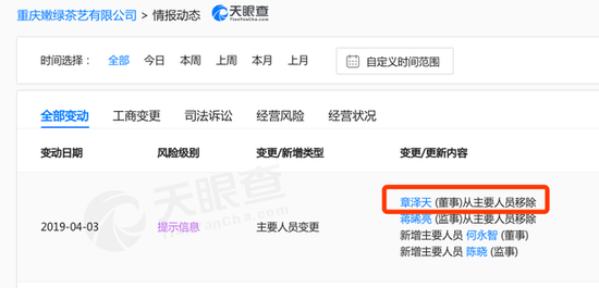 新浪科技讯 4月3日下午消息,奶茶妹妹章泽天又有了新消息。今日,章泽天卸任重庆嫩绿茶艺有限公司董事一职,该公司由刘强东间接持股。