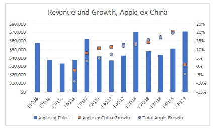 大中华区对于苹果的意义,已经不是一个“重要市场”就能概括。2018财年苹果总营收的五分之一来自于大中华区,过去十个季度,苹果大中华区的营收同比增速均值为10%,而总营收的增速均值只有8%。