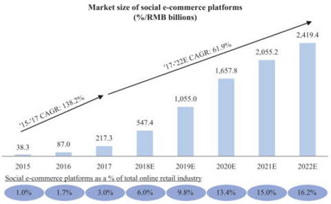 但随着未来互联网红利的衰退,社交电商通过裂变式增长迅速发展,未来社交电子商务平台规模将在在2022年达到2.42万亿元,从2017年复合增长率将达到61.9%。
