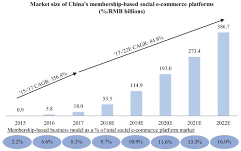 而且会员制社交电商发展更为迅速,预计2022年市场规模达到3867亿元,从2017年复合增长率达到84.8%。