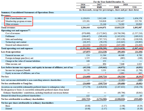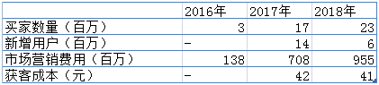 营收方面,公司2016年、2017年营收分别为12.84亿、64.44亿;2018年与拼多多的131亿元几乎持平,达到130.15亿元,其中,商品销售净营收为113.88亿元,会员计划营收为15.52亿元,其他营收为7440万元。