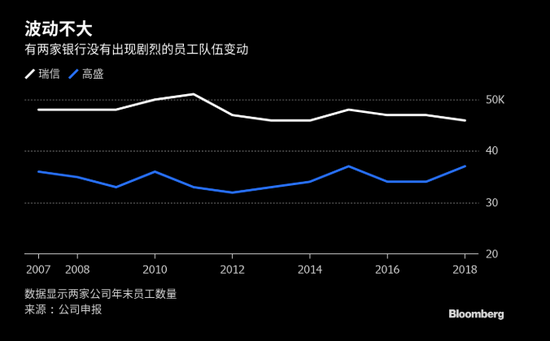 各种因素此消彼长,使得高盛和瑞信的员工总数一直相当稳定。尽管过去两年受到监管责难,但富国银行的裁员幅度最小,其员工人数比2010年的峰值减少不到5%。