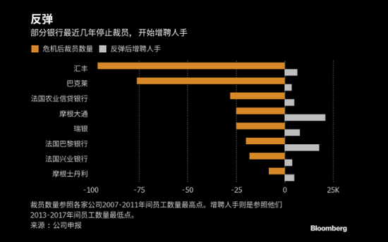 彭博汇总的数据显示,在金融危机之后,美国和欧洲16大金融企业总共裁员80.2万,但其中9家公司已经新增了7.6万个职位。摩根大通和法国巴黎银行几乎完全回到裁员前的员工规模。