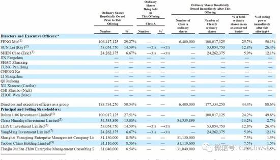 IPO后,冯敏持股为25.7%,拥有50.7%的投票权;SUN Lei (Ray)持股12.8%,拥有26.4%的投票权;SHEN Chao (Eric)持股为5.9%,有12.1%的投票权。