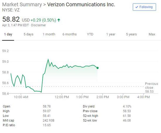 消息发布后,威瑞森股价止跌转涨,盘中最大涨幅0.9%,一度冲破59美元,但接近五日来低位。