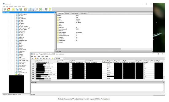 第二组来自2014年就已下线的Facebook第三方开发应用程序At the Pool,数据集被存放在另一个亚马逊S3云存储服务器中,虽然容量不是很大,但包含了更多敏感信息,包括从2.2万多个Facebook用户处抓取的信息,例如用户的朋友列表、电邮地址、兴趣、照片、小组、签到等。