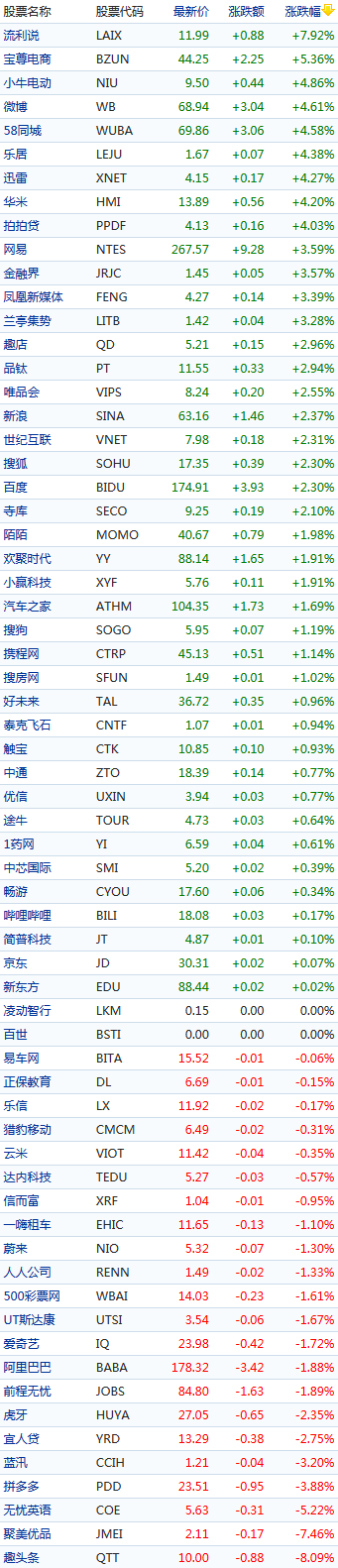 中概股涨跌不一,其中9支股票涨幅超过4%,流利说涨7.92%报11.99美元,宝尊电商涨5.36%报44.25美元,小牛电动涨4.86%报9.50美元,微博涨4.61%报68.94美元,58同城涨4.58%报69.86美元,乐居涨4.38%报1.67美元,迅雷涨4.27%报4.15美元,华米涨4.20%报13.89美元,拍拍贷涨4.03%报4.13美元。