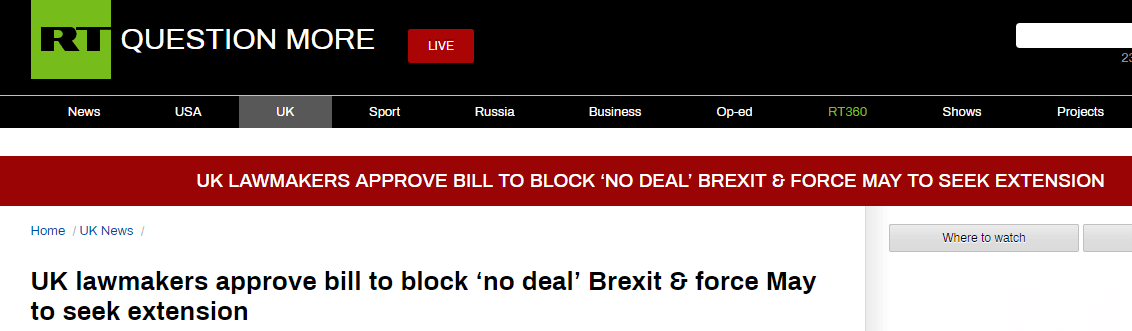 “今日俄罗斯”(RT)3日报道称,在当日的投票中,英国国会下议院以313票赞成、312票反对通过了上述法案。RT称,如果这项由工党和保守党联合提出的法案继续在上议院被通过,则将迫使首相寻求进一步延期,并且立法反对可怕的“无协议脱欧”情况。