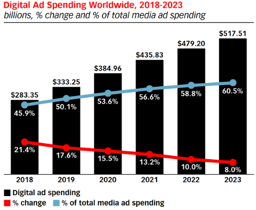 过去5年,公司业绩取得了快速增长,背后离不开整个数字广告行业的增长。根据报告,预计全球数字广告开支将持续增长,到2023年增至每年5180亿美元,年复合增速达13%。18年数字广告市场整体增长400亿美元,其中公司增长达150亿美元,行业长期增长将有效支撑后续的业绩,不过随着体量变大,增速相比之前有下滑趋势。