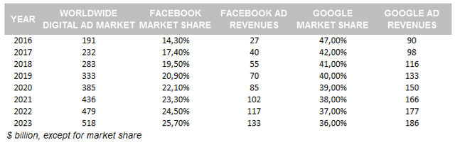 谷歌是数字广告的第一龙头,体量大于公司。不过,从增长及盈利而言,公司具有绝对优势。比较两者全球广告市占率变动,可发现谷歌的下滑对应公司的增长。18年400亿整体数字广告市场增量中,谷歌与公司分别获230亿及150亿美元。笔者预计,到2022年,公司有望广告收入增长150亿美元,谷歌对应增长90亿美元,公司首次增长盖过谷歌。