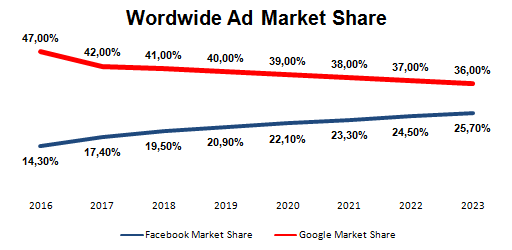 16年谷歌市占达47%,17年丢失约5%的份额,此后一直下滑到18年,只不过速度放缓。公司则争夺其丢失的大部分份额,市占从14.3%增至19.5%。据此,未来几年趋势持续,两者预计市占份额变动如下图,未来随着市场成熟,市占率增速将降为每年1.2%,低于17、18年两年的平均增苏1.2%。