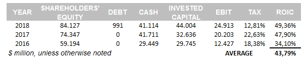 从盈利及变现角度,同样体量下行业内找不到第二家更好的公司,过去三年平均EBIT利润率高达46%,远高于谷歌的25%。另外,其平均ROE(权益回报率)高达24%,平均ROA(资产回报率)达39%,另外ROIC(投入资本回报率)更高达近44%。根据巴菲特表述,能保持15%以上ROIC的公司具有护城河,盈利能力很难受重大影响。