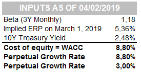 债务数额较小,作忽略处理。另持有现金达410亿美元,WACC(加权平均资本成本)与权益成本相同,税率设为法定税率21%(比去年平均有效税率高)。
