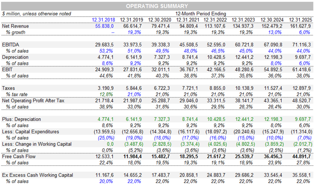 过去四年平均资本开支占营收比例为19%,同期年化营收增速为46%,未来假设营收增速下滑的话,预计资本开支也有所下滑,5年中每年下滑1个百分点,最后两年预计下滑至7%。