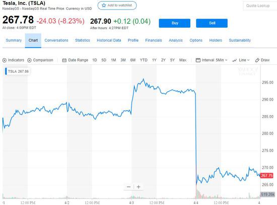 美东时间4日周四,受一季度交付量大幅下降影响,特斯拉美股盘前跌幅一度达10%,当天大幅低开10%,盘初跌幅达到10.7%、接近跌破260美元,创3月25日以来盘中新低,后跌幅有所收窄,收跌8.23%,创3月26日以来新低,盘中和收盘都创今年1月18日以来最大跌幅。
