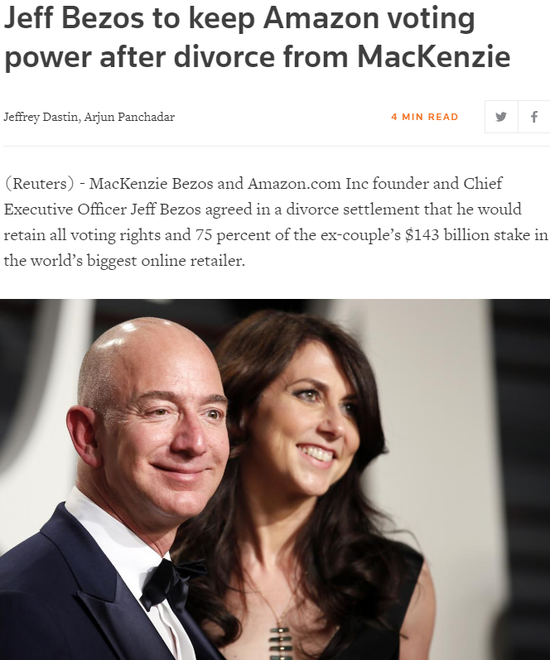 这一声明消除了投资者的一些担忧,此前这对夫妇宣布计划离婚,协商包括亚马逊股份在内的财产分割问题。根据离婚法律专家的说法,贝佐斯夫妇的离婚代表了一种独特的情况,因为他们在亚马逊成立之前就在一起了,他们两人共同拥有这笔巨额财产。而对于其他离婚的富豪,大多数都是在获得财富后才认识他们的配偶的。