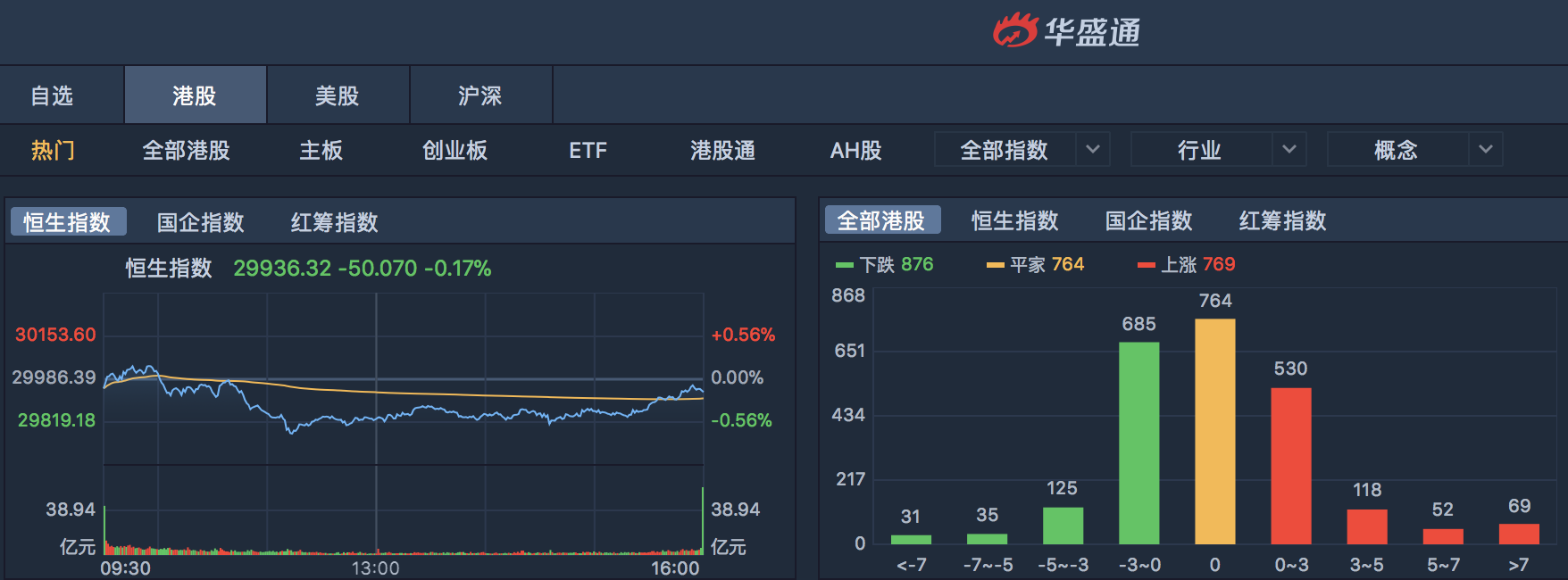 恒指早盘低开0.12%,随后小幅走高,一度站上30000,但由于量能不足,又逐步回落。截至收盘,恒生指数跌50.07点或0.17%,报29936.32点,全日成交额达1089.92亿。国企指数跌0.11%,报11692.37点,红筹指数跌0.28%,报4728.88点。