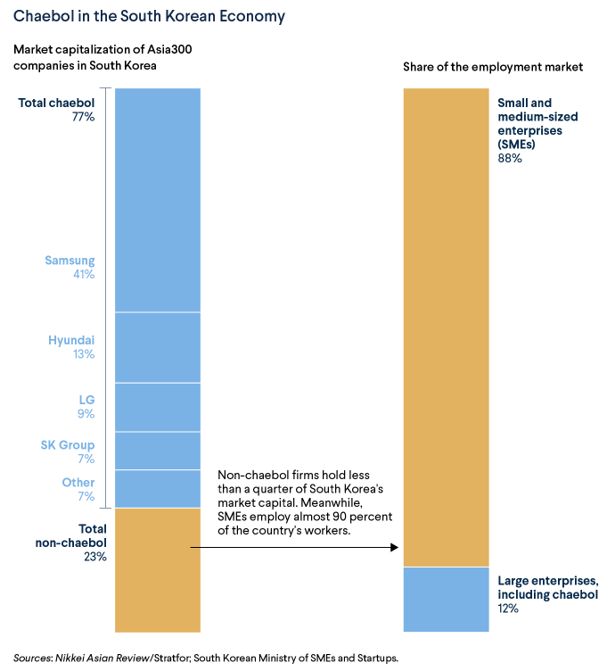 在日经Asia300指数中,韩国财阀的市值在该指数中所有韩国企业市值中的占比高达77%,然而包括财阀在内的韩国大型企业只贡献了该国12%的就业,大部分就业是由这个国家的中小企业创造的。