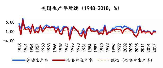 一是美国劳动生产率增速趋势下行。根据旧金山联储的测算,1948-2008六十年间,美国社会劳动生产率年均为2.48%,全要素生产率年均1.38%。而金融危机以来的2009-2018十年间,劳动生产率年均仅提升1.39%,全要素生产率更低至0.63%,显著低于危机前的水平,更低于林顿时期由于高新技术产业的财政支持和税收优惠,促进了产业结构的升级,带来的劳动生产率3%的年均增速。大大低于历史平均水准的生产率增长,说明美国这一轮复苏相对脆弱,还未回归危机前的增长水平。而历史上每一次经济危机,都伴随着生产率的下降,因此,全要素生产率的趋势下行也是一个美国经济基本面可能发生转化的预警。
