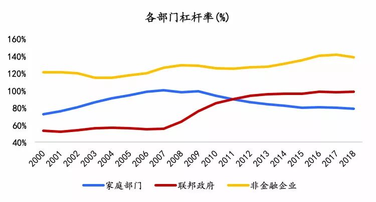 图表9 联邦政府杠杆率不断上升,家庭部门杠杆率下降