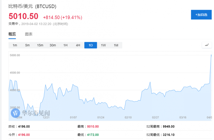 然而,比特币的涨幅并未停止在4700美金,随即比特币价格又出现了一次接近7%的涨幅,站上了5000美金——这是市场认为的比特币价格重要心理关口,自2018年11月下旬跌破这一关口后,比特币价格就再也未能回到这个点位。