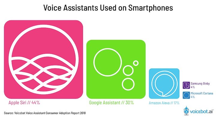 ▲ 在智能手机方面,Siri 市场份额约占 44%,Google Assistant 约 30%,而 Alexa 只有 17%。数据来自:Voicebot