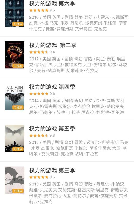 这些有利于沉淀优质用户、吸引中高端品牌的特征,加之本身版权费用比国内大剧低廉,让《权游》等头部美剧成为视频网站购买版权的首选。2015年起,腾讯视频与HBO达成独家版权合作,《权游》第五季播放量超过其他平台独播美剧播放量总和。该合作也延续到了游戏领域。