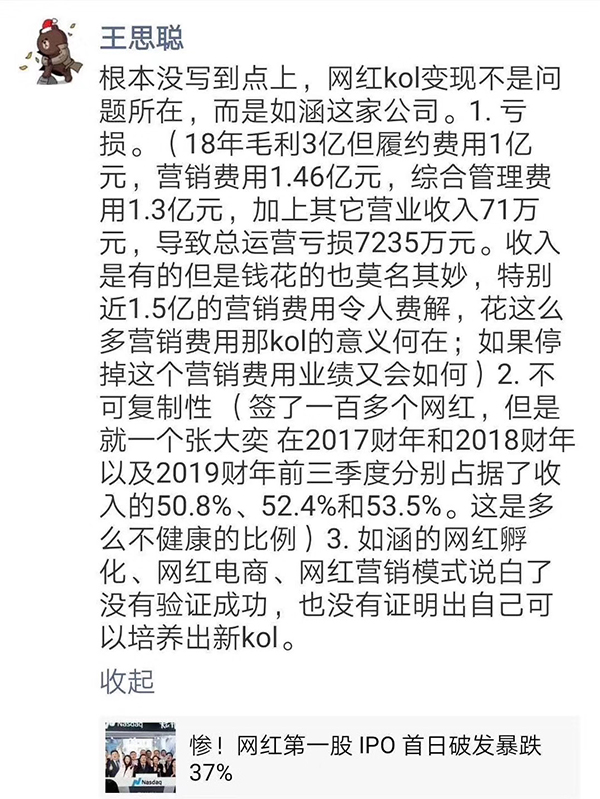 三是如涵的网红孵化、网红电商、网红营销模式没有验证成功,也没有证明出自己可以培养出新KOL。