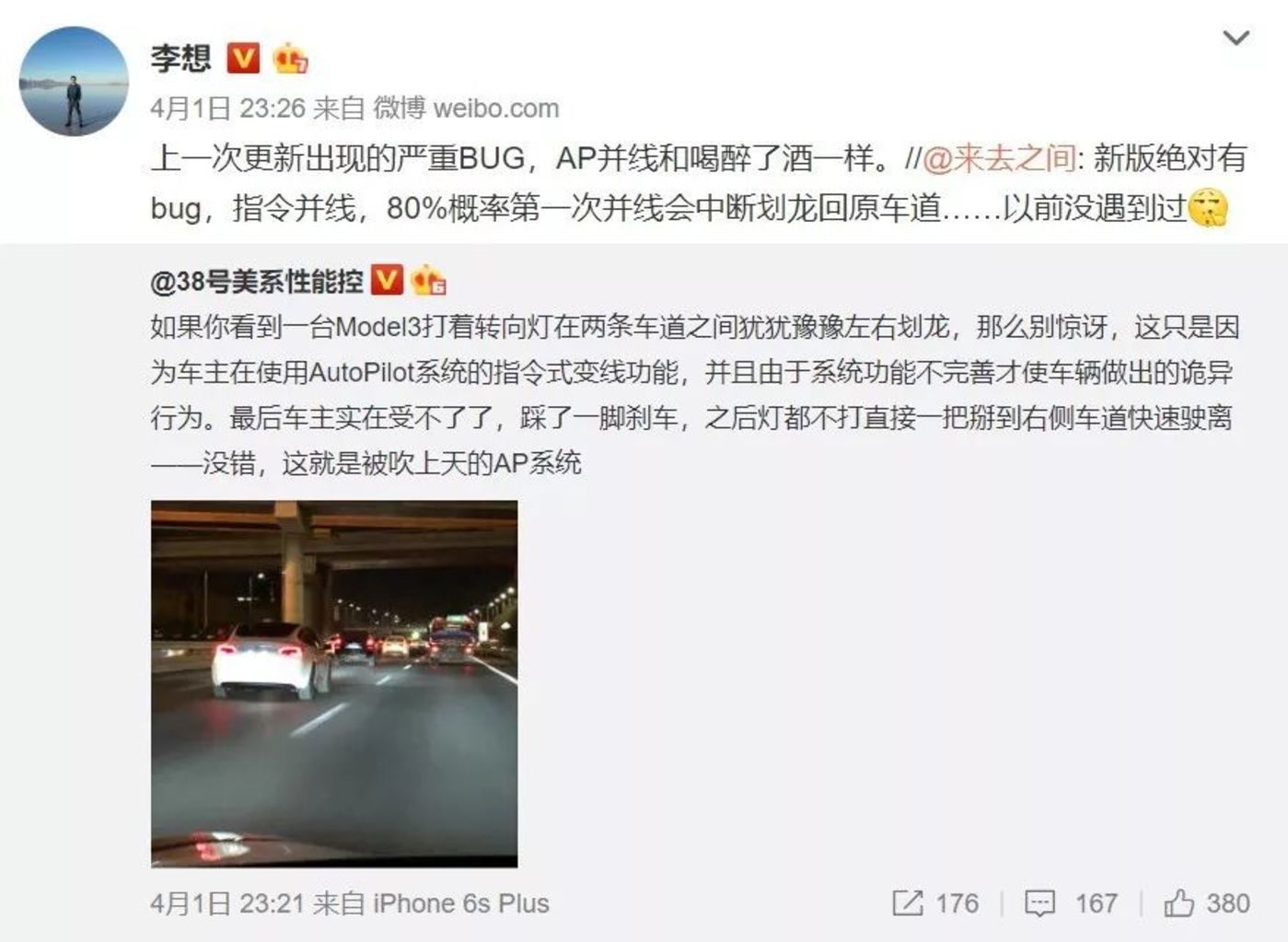 实际上早在 4 月 1 日,38 号就专门发微博吐槽过 AP 变道匪夷所思的 Bug,并得到了另外两位新浪网友、特斯拉 Model S/3 车主@来去之间和特斯拉 Model X/3 车主@李想的认可。这说明这个问题不是个例,是系统级 Bug。但两位网友都不约而同地提到这是新版本的 Bug,在我们的实际驾驶过程中,42HOW 的 Model 3 也存在相同的问题。