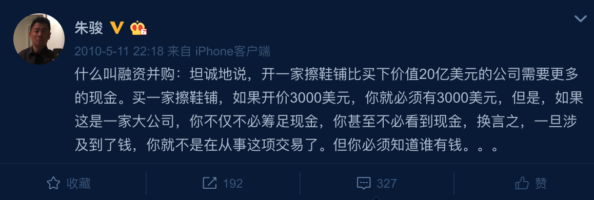 2010年5月11日,朱骏发布微博称:「买一家擦鞋铺,如果开价3000美元,你就必须有3000美元,但是,如果这是一家大公司,你不仅不必筹足现金,你甚至不必看到现金,换言之,一旦涉及到了钱,你就不是在从事这项交易了。但你必须知道谁有钱。」