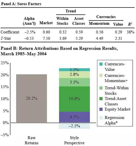 下面这张图来自索罗斯的归因分析,我们看到索罗斯更像是一个Beta选手,当然由于他在多资产类别下注,也不能归因索罗斯就是受益于某些长期风口。他的年化收益率中,有10.6%来自资产类别的趋势,3.5%来自股票的趋势,2.8%来自汇率的动能,1.2%来自汇率的价值。可以说,索罗斯的超额收益,主要来自正确把握大类资产的趋势。