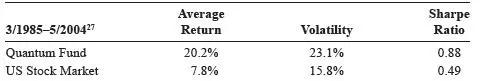 我们再来看看索罗斯的收益率。AQR选取了量子基金从1985年到2004年的收益率数据。这个阶段中,索罗斯完成了几大战役,包括阻击英格兰央行,掀起东南亚金融危机,还和强大的中国央行在香港决斗了一下。我们看到,索罗斯在这个阶段的年化收益率为20.2%,相比于美国股票取得了12.4%的超额收益率。由于索罗斯交易的大头在外汇和国债市场,包含了巨大的杠杆,导致量子基金的年化波动率23.1%,比美国股市更高。最终从夏普比例看,索罗斯的夏普比例0.88,这个夏普比例比巴菲特更高。