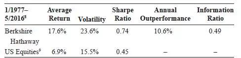 我们先看看巴菲特的数据。AQR选取了巴菲特从1977到2016年的投资收益率数据,其中巴菲特的年化收益率17.6%,对比同期美国股票年化收益率6.9%,巴菲特取得了10.6%的年化超额收益率。当然,巴菲特因为通过伯克希尔哈撒韦保险公司的浮存金模式,加了1.6倍的杠杆,导致巴菲特的波动率也更大一些。从夏普比例看,巴菲特的夏普比例0.74,比指数的夏普比例0.45高了不少。