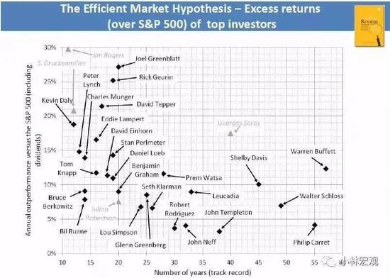 这张图的横轴对应投资年限,纵轴对应的年化超额收益(注,不是年化收益率,而是超额收益率)。索罗斯拥有40年的投资年限,巴菲特超过58年,投资年限巴菲特显然超过索罗斯,也是所有投资大师中,最长的一位。从超额收益率角度看,索罗斯的年化超越收益率为18%,比巴菲特的13%更高,战胜市场的能力看,似乎索罗斯又更高一筹。