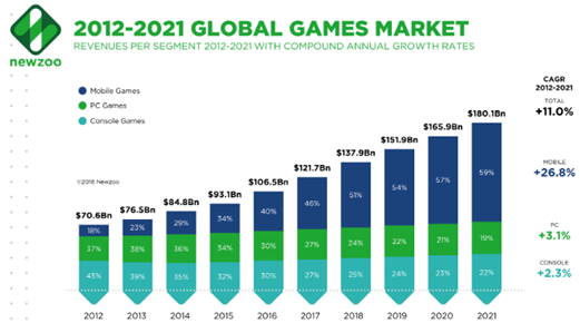 根据Newzoo预计,到2022年,移动端游市场年复合增长率将超过10%,届时移动端游市场规模将超过主机与PC市场的总和,占据游戏市场总规模的51%;预计2021年移动端游市场规模将达到1060亿美元。