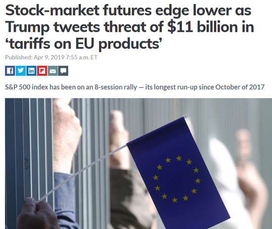 特朗普政府周一提议对价值约110亿美元的欧盟进口商品加征关税,并称由于欧盟对飞机制造商空中客车提供补贴,美国此举师出有名。